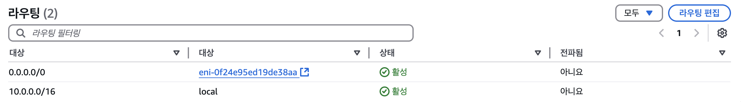 * 참고로 설정을 하고나면 아래와 같이 대상이 eni- 로 시작하게 되는데 이는 Elatic Network Interface로 네트워크 카드 리소스랑 직접적으로 mapping되는 것을 확인할 수 있다. 이는 OS 레벨에서 2계층(데이터 링크 계층)과 3계층(네트워크 계층)을 거쳐 다른 대상으로 트래픽을 전달한다는 점을 유추할 수 있다. (위에서 만든 커뮤니티 AMI에서 이 설정이 되어 있는 것이다)