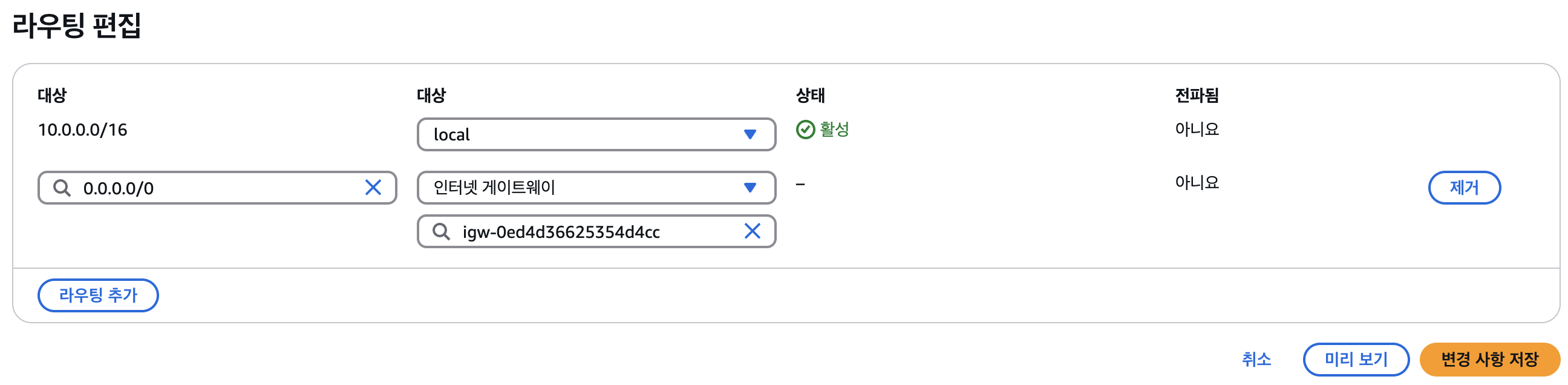 Public subnet의 routing table 참고만 하세요. (인터넷 게이트웨이와 연결하지 않으면 AWS에서는 외부 통신이 안됩니다)