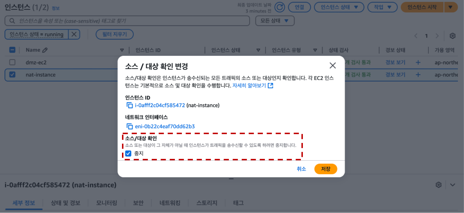 EC2 대시보드에서 본인이 만든 nat-instance를 클릭한 이후 오른쪽 상단의 '작업' tab 하위에 '네트워킹'의 '소스/대상 확인 변경'을 클릭한다. (라우팅 테이블외에도 AWS EC2 인스턴스 자체의 설정을 바꿔줘야 한다)