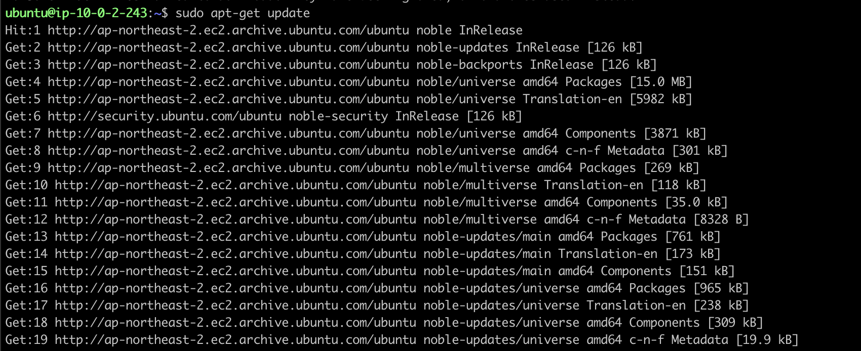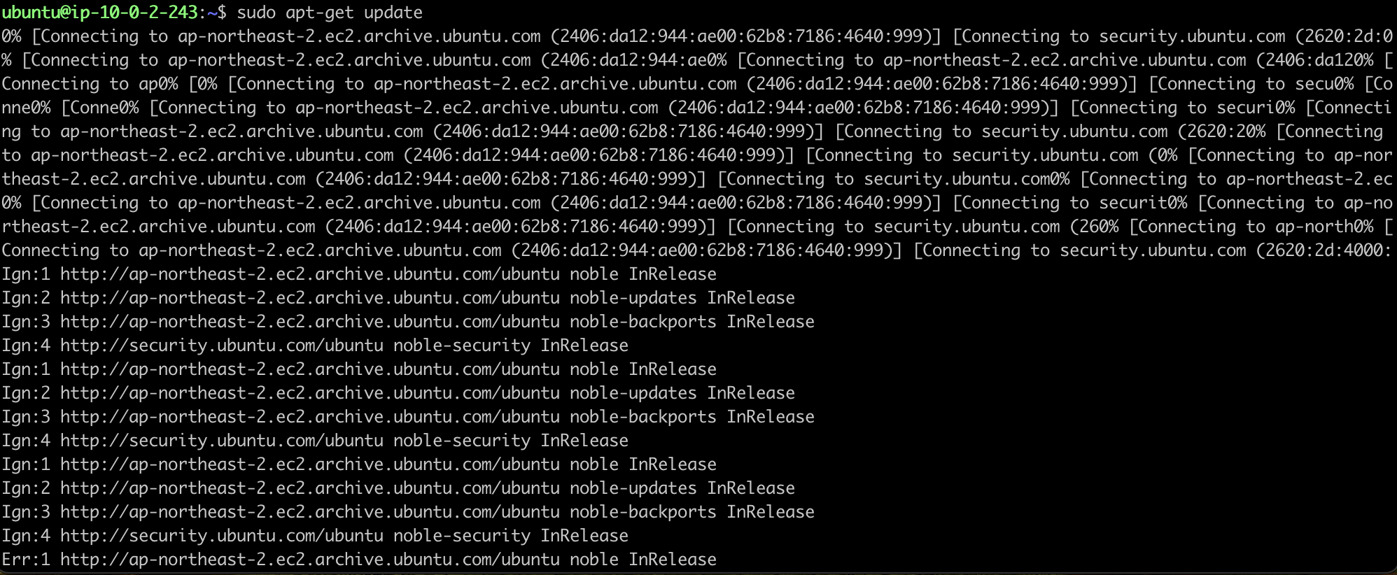 Nat Instance를 연결하기 전에는 sudo apt-get update 를 통해 debian계열이 주로 사용하는 apt저장소 update가 되지 않는 것을 확인할 수 있다. 하지만 연결 이후에는 잘 받아지는 것을 확인 할 수 있다.