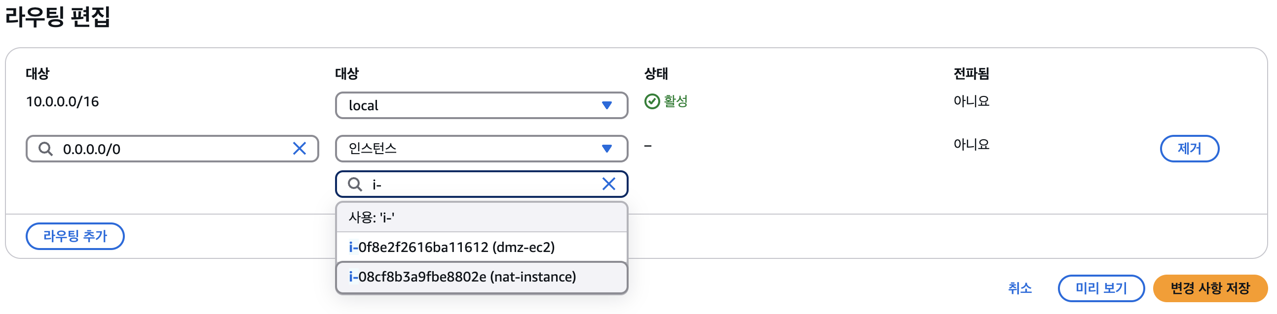 Private subnet: routing table에서 대상을 '인스턴스'로 설정하고 그 아래는 내가 위에서 만든 Nat-instance를 선택한다 (저의 경우 nat-instance라고 명명했습니다) 이 의미는 private subnet에서 인터넷으로 나가는 모든 트래픽이 Nat-instance를 거친다라고 이해해도 무방하다.