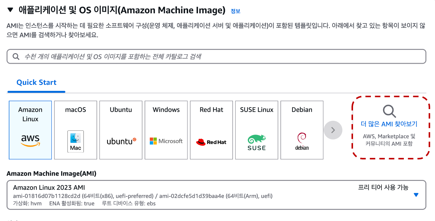 EC2생성창에서 "더 많은 AMI 찾아보기"를 클릭한다.