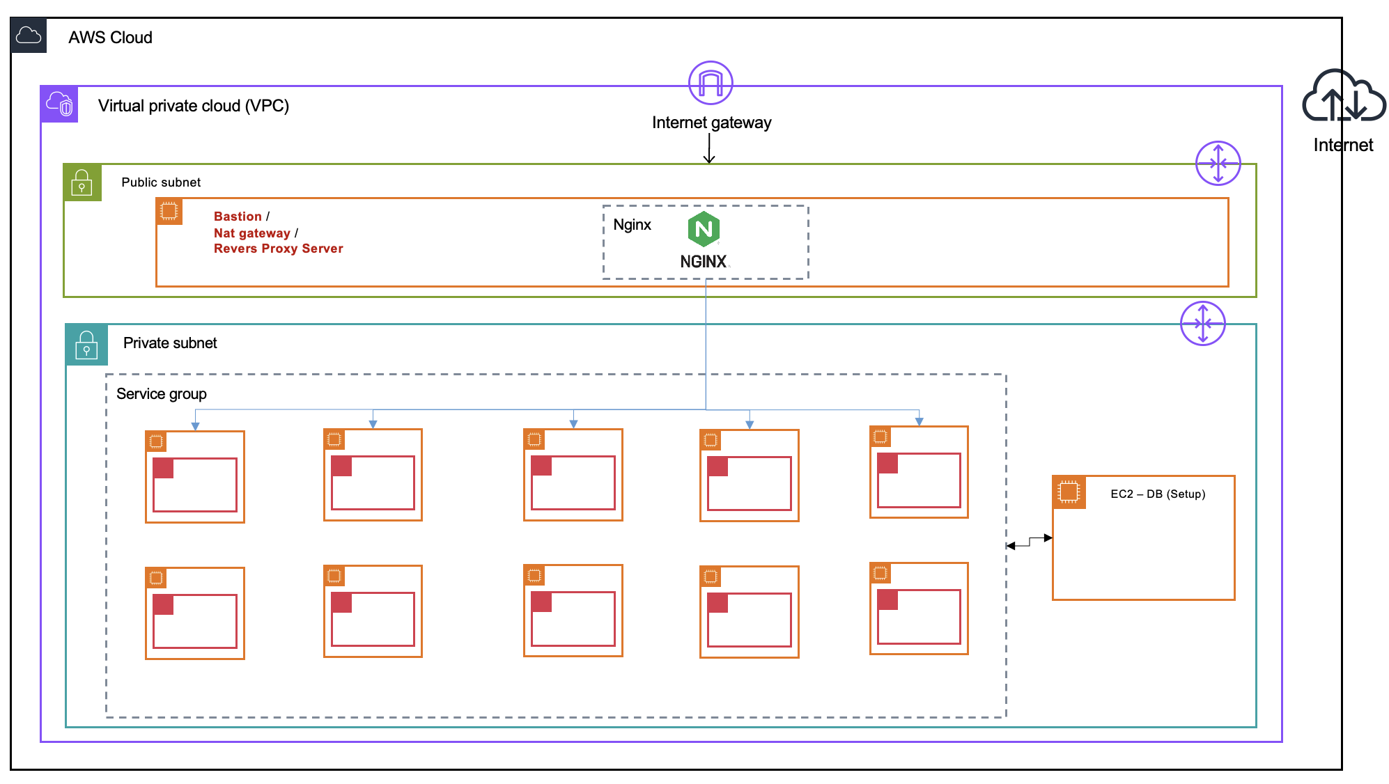 원래는 사설망(Private subnet)에 인터넷과 통신이 되게 하기 위해서는 Nat Gateway가 필요하다. 하지만, 이번 구성에서는 Public subnet에 Nat Gateway를 따로 두지 않고, EC2(Nat Instance)를 통해 Private Subnet의 인터넷을 연결시키고자 했다. 동시에 Revers Proxy Server의 역할과 Bastion Server의 역할을 동시에 하게 했다.